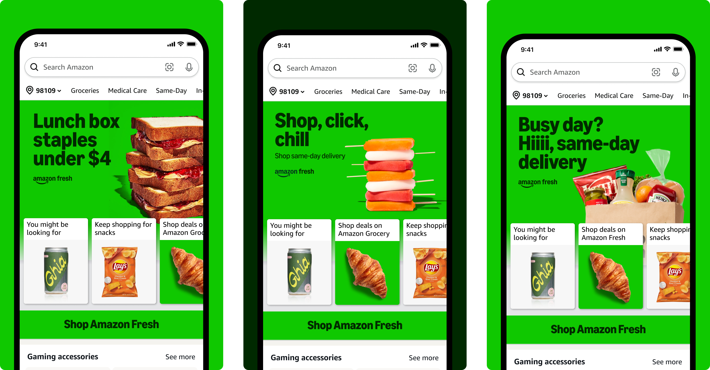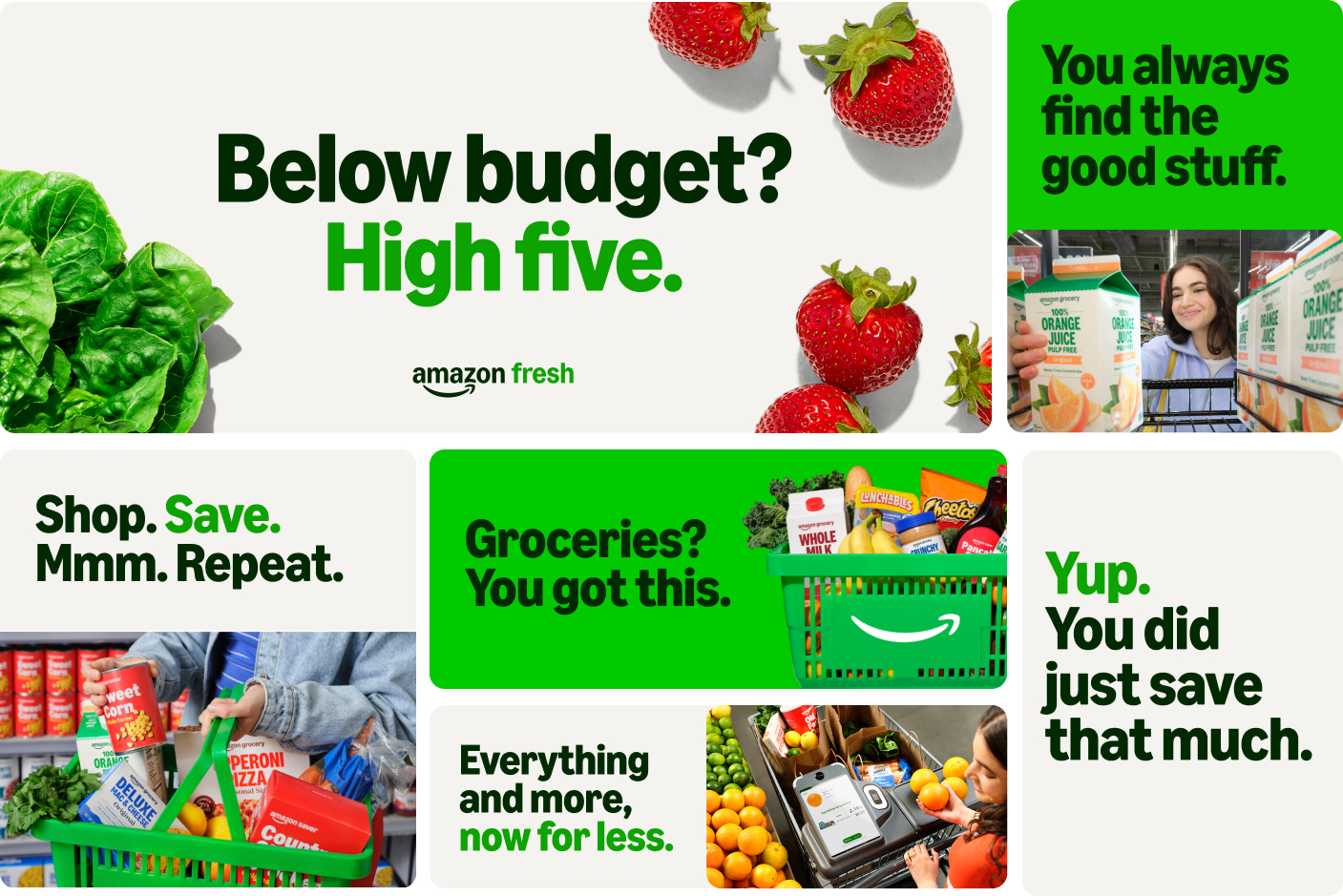 As a Senior Art Director on the Amazon Fresh brand team, I helped lead conceptual development and creative execution across brand, retail, and performance-driven campaigns. The work spanned new store openings (NSO), seasonal and sales moments, packaging, photography, and integrated print + digital experiences, all executed within Amazon’s brand system.